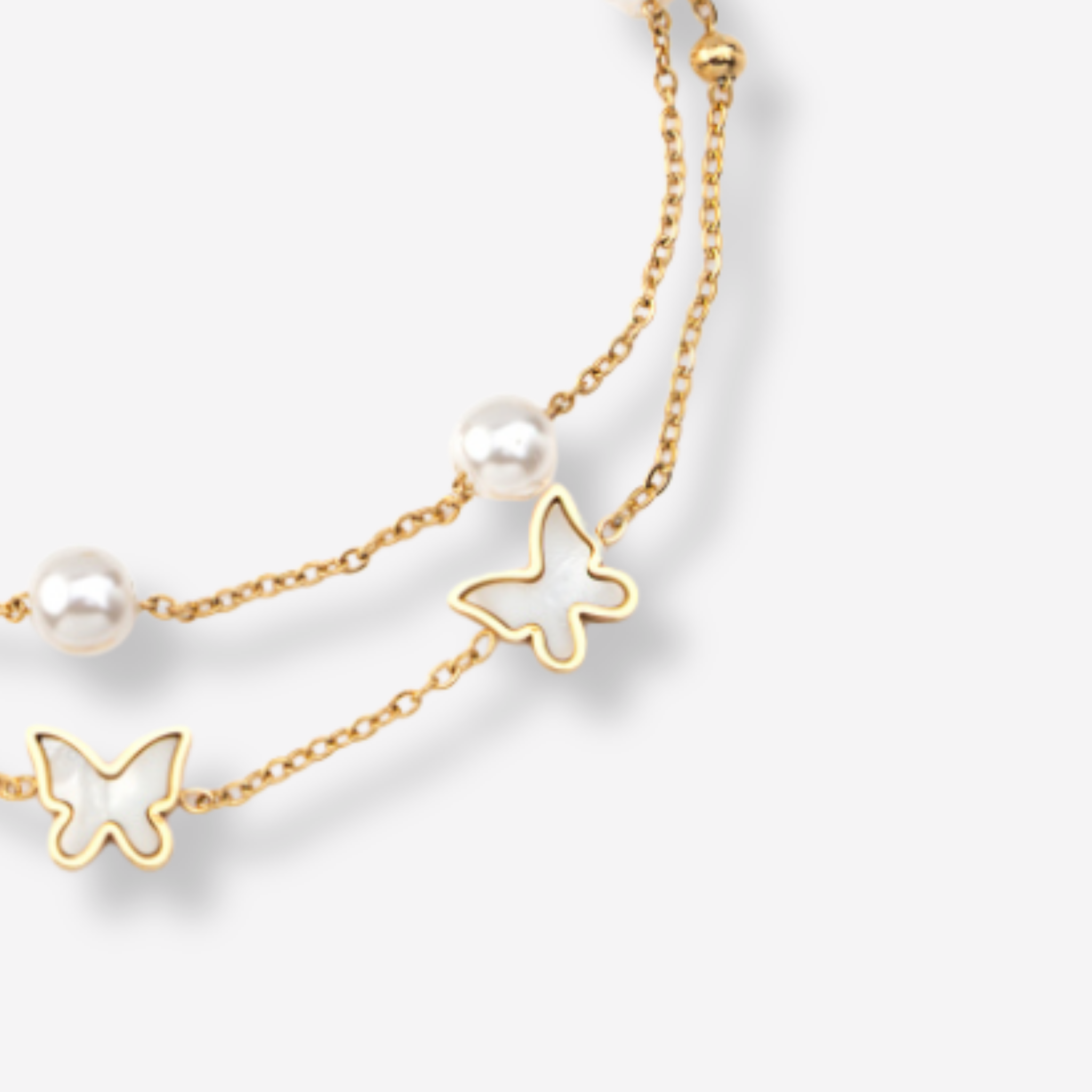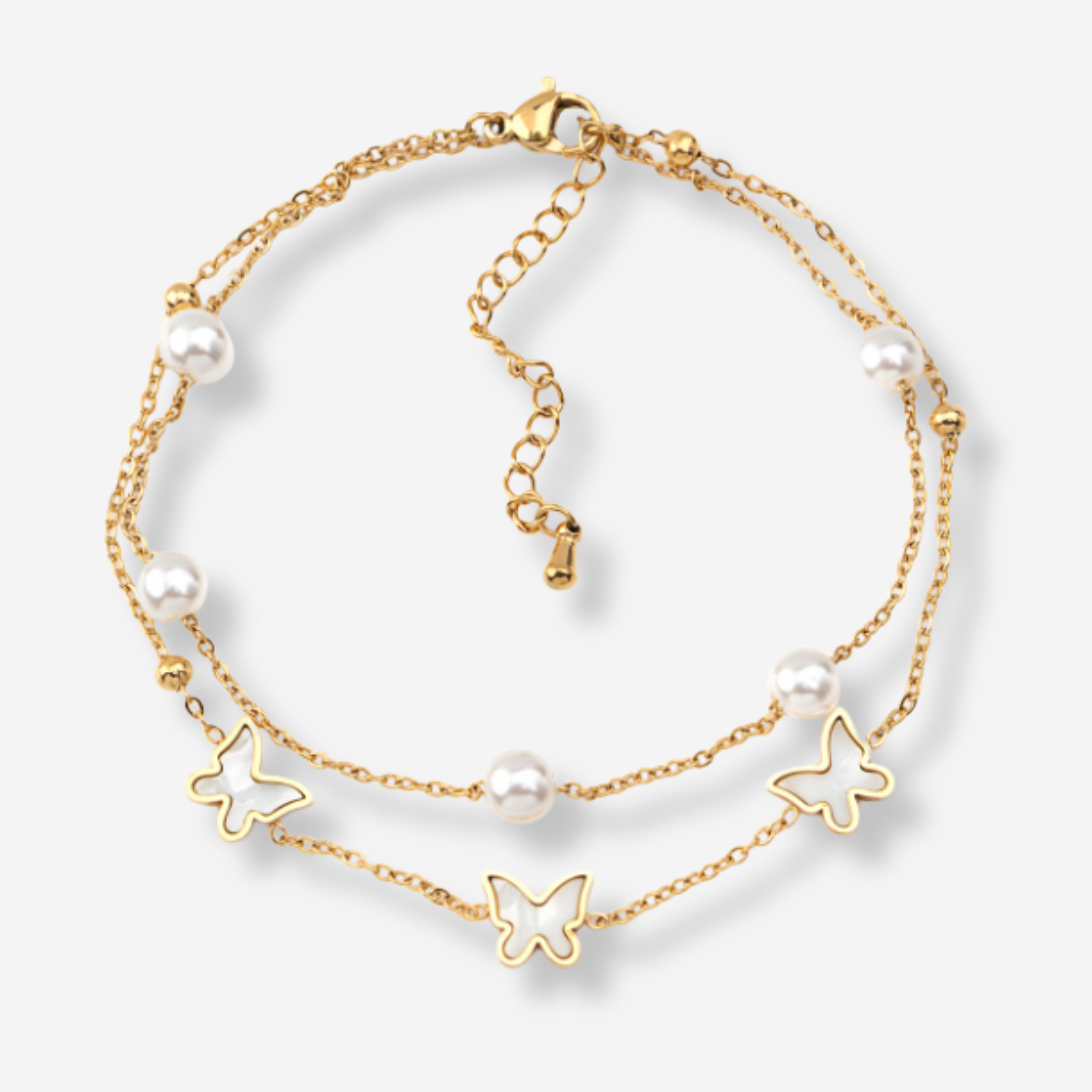 Tornozeleira Dupla com Borboletas Madrepérola e Pérolas em Aço Inoxidável