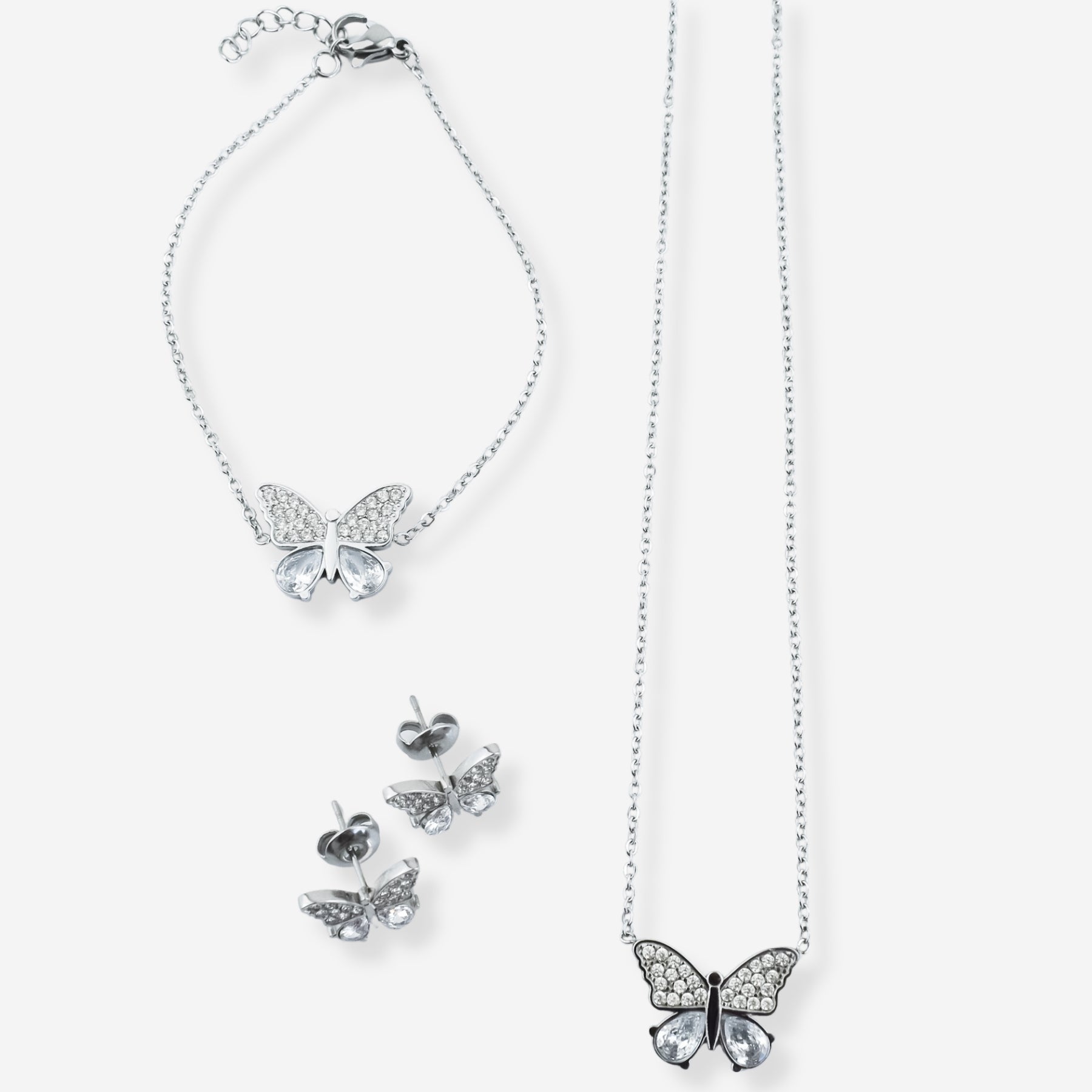 Parure Ambre – Boucles d'Oreilles, Collier et Bracelet en Acier avec Papillon et Zircones
