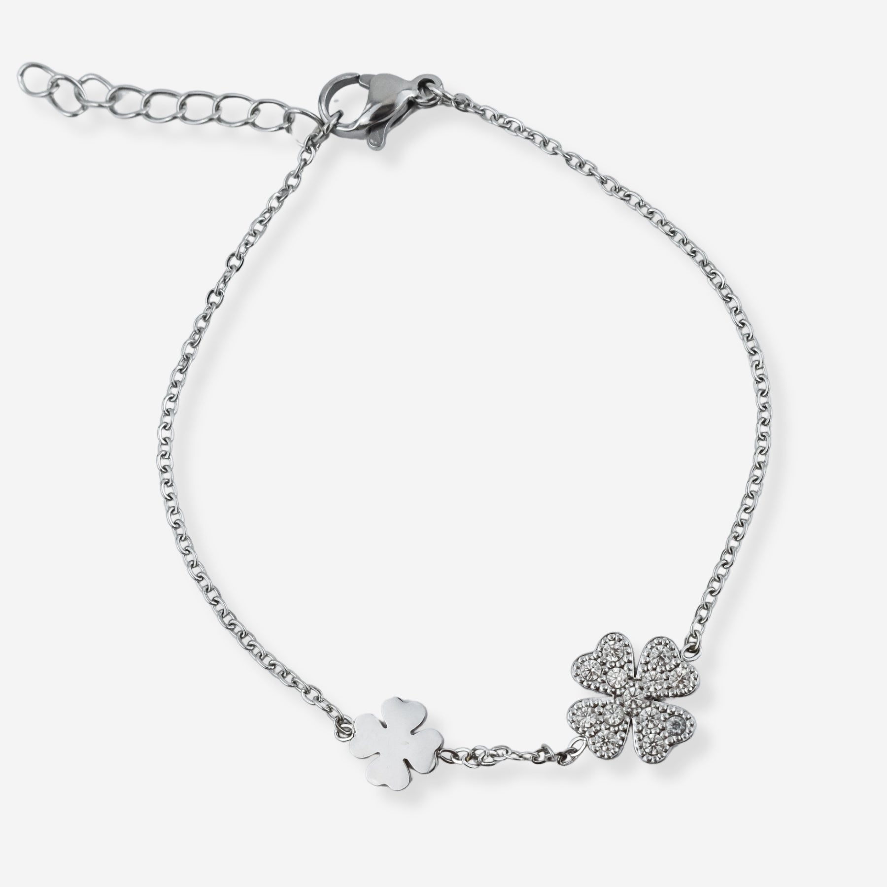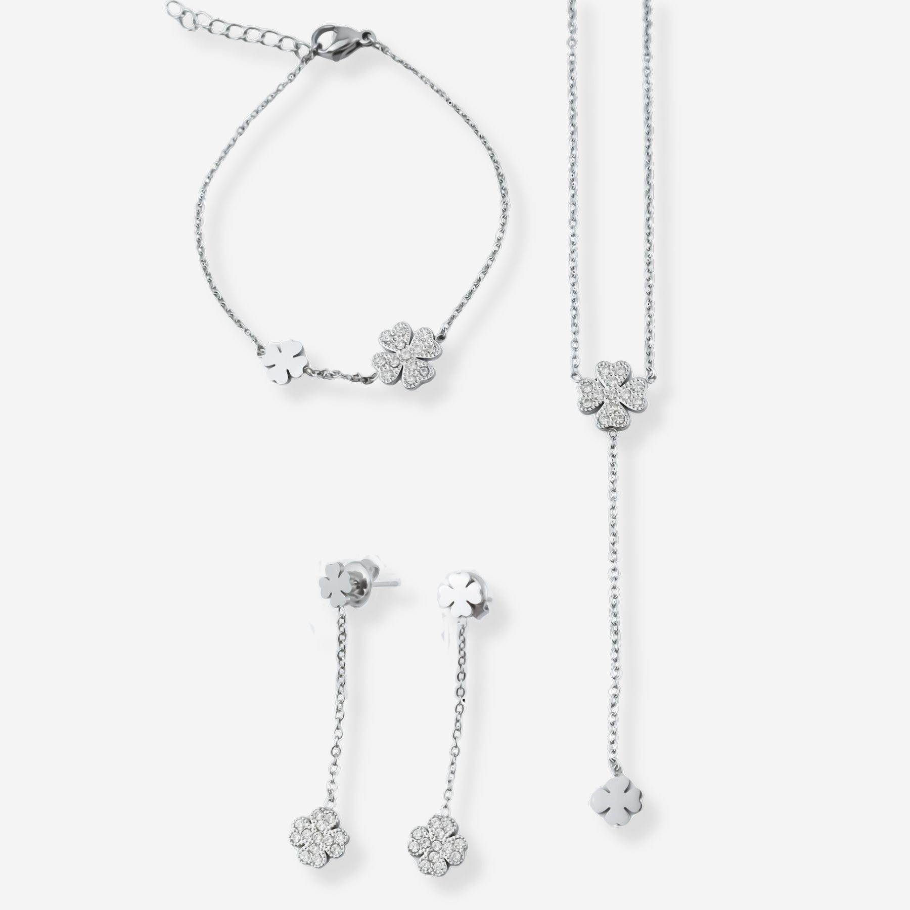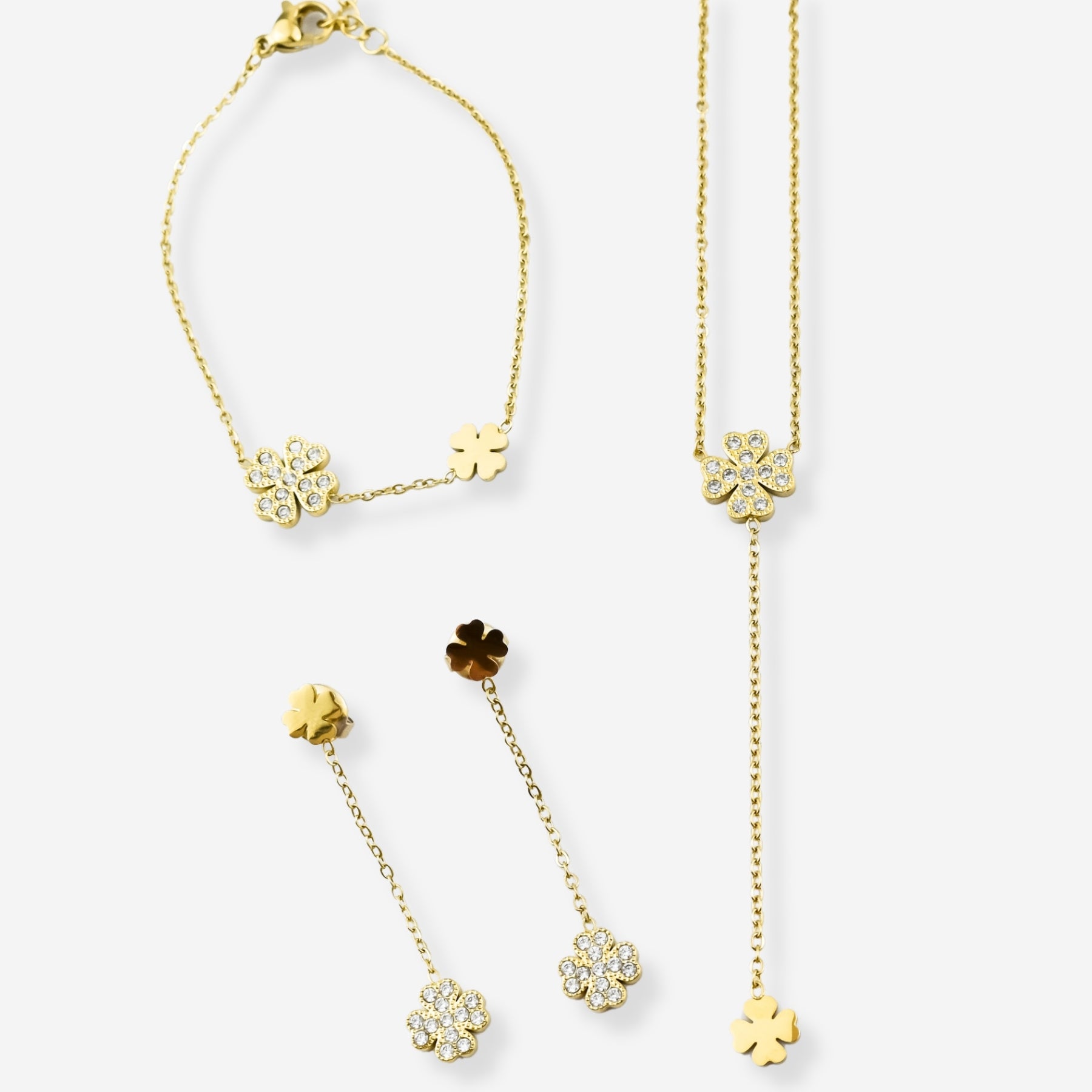 Parure Émeraude – Boucles d'oreilles, collier et bracelet en acier avec trèfles et zircones