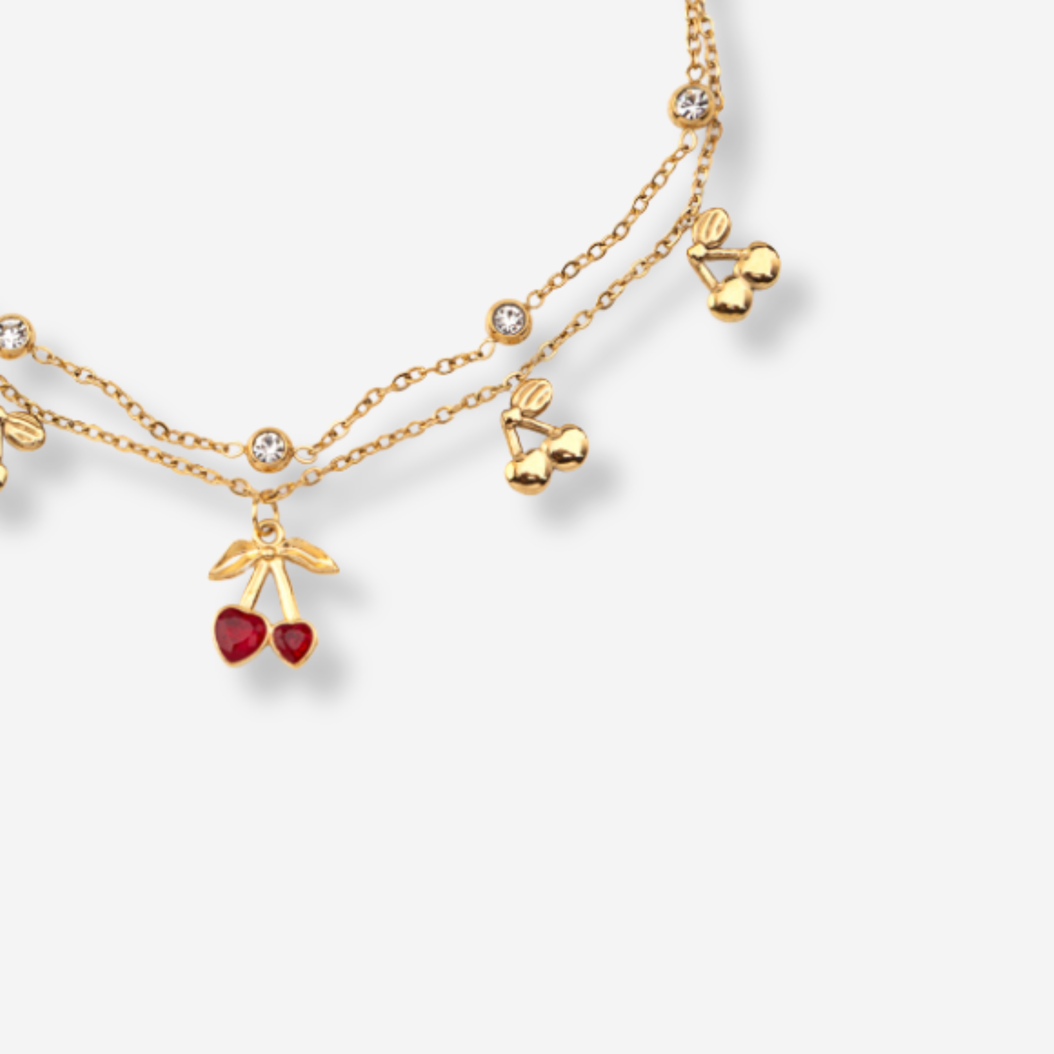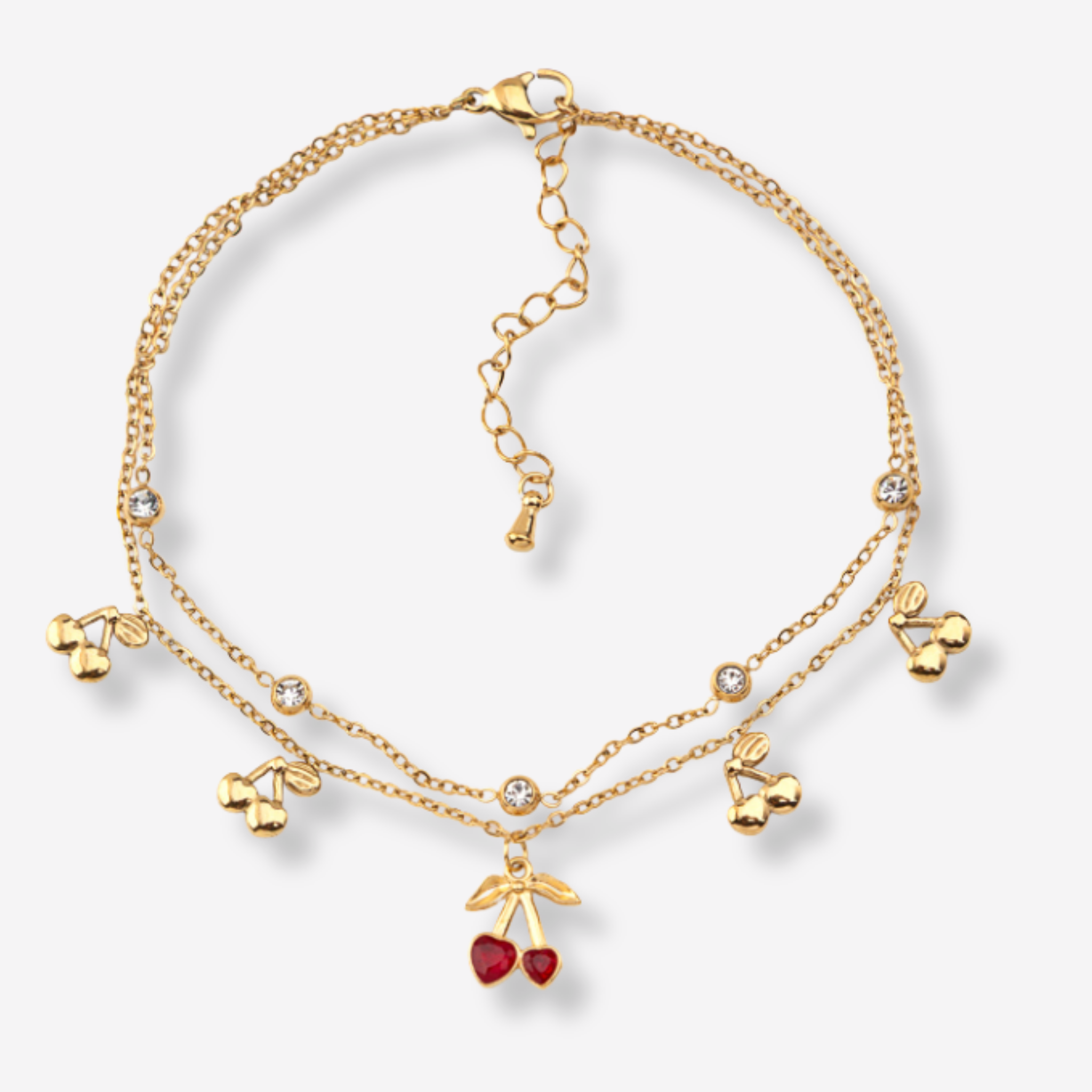- Tornozeleira Dupla com Cerejas e Brilhantes em Aço Inoxidável