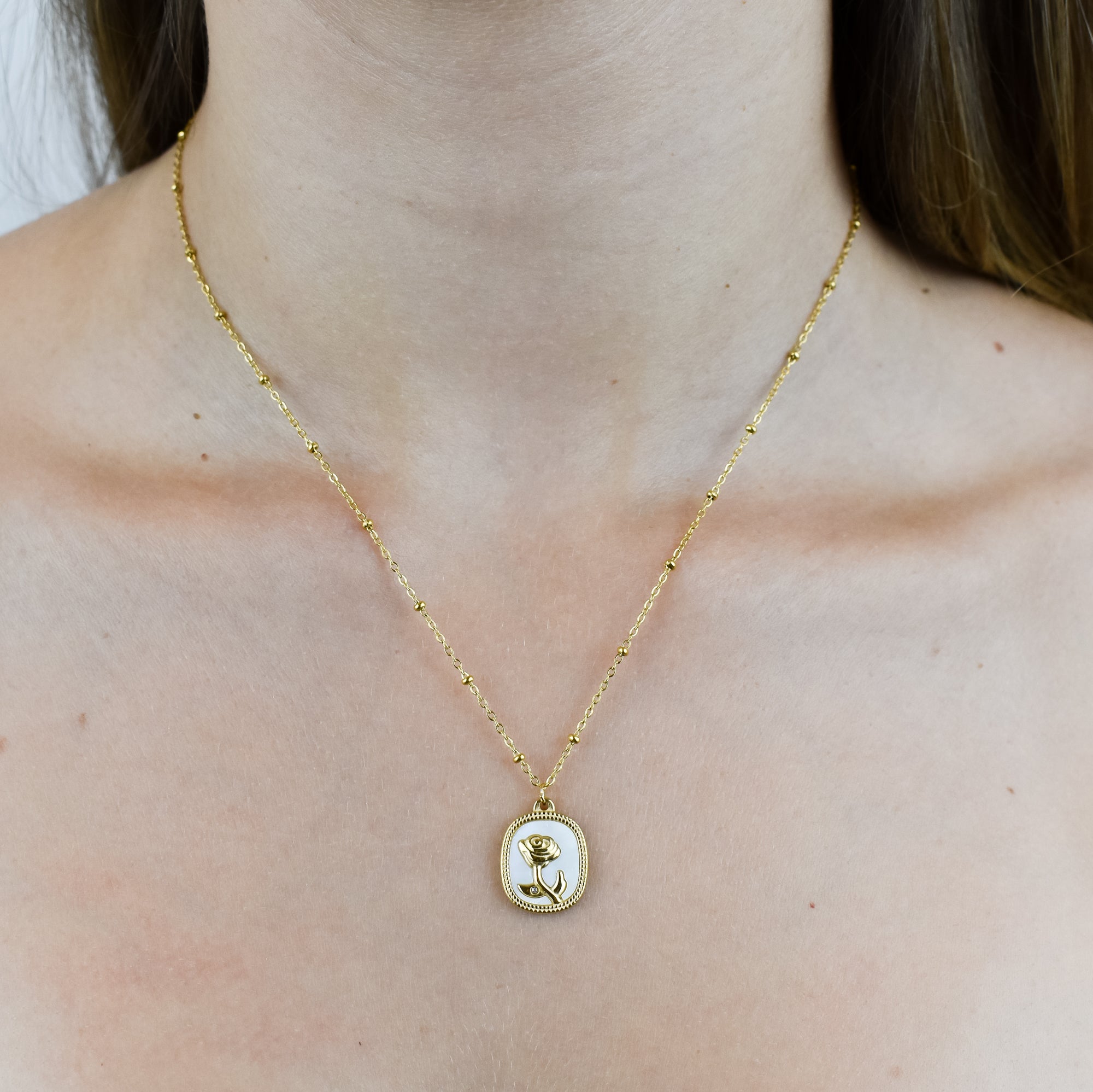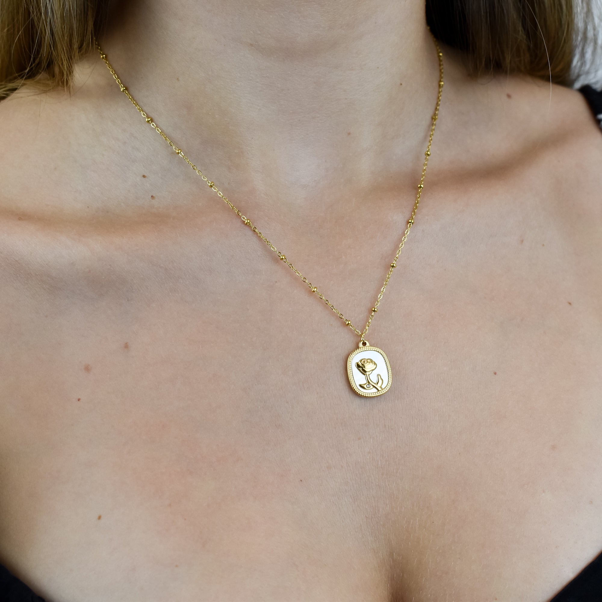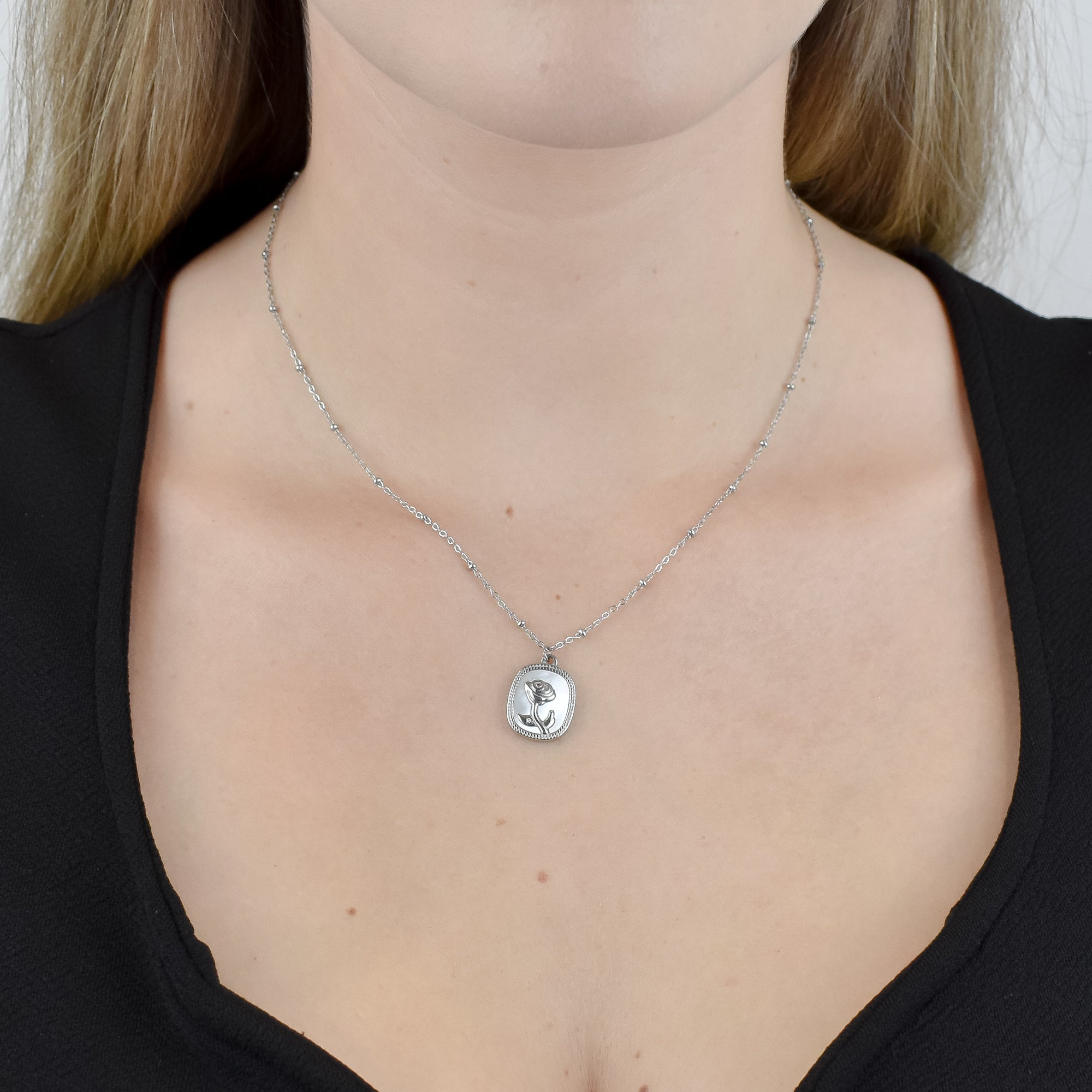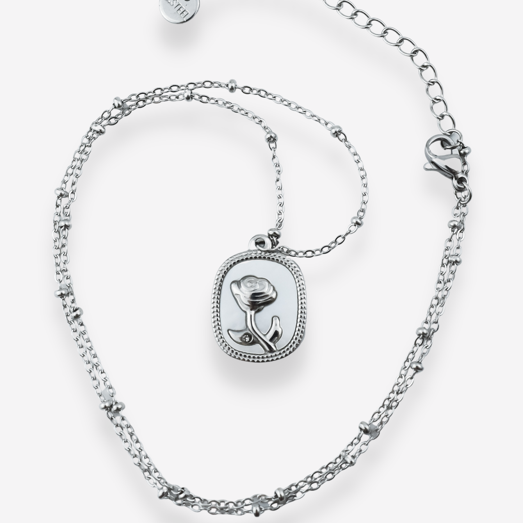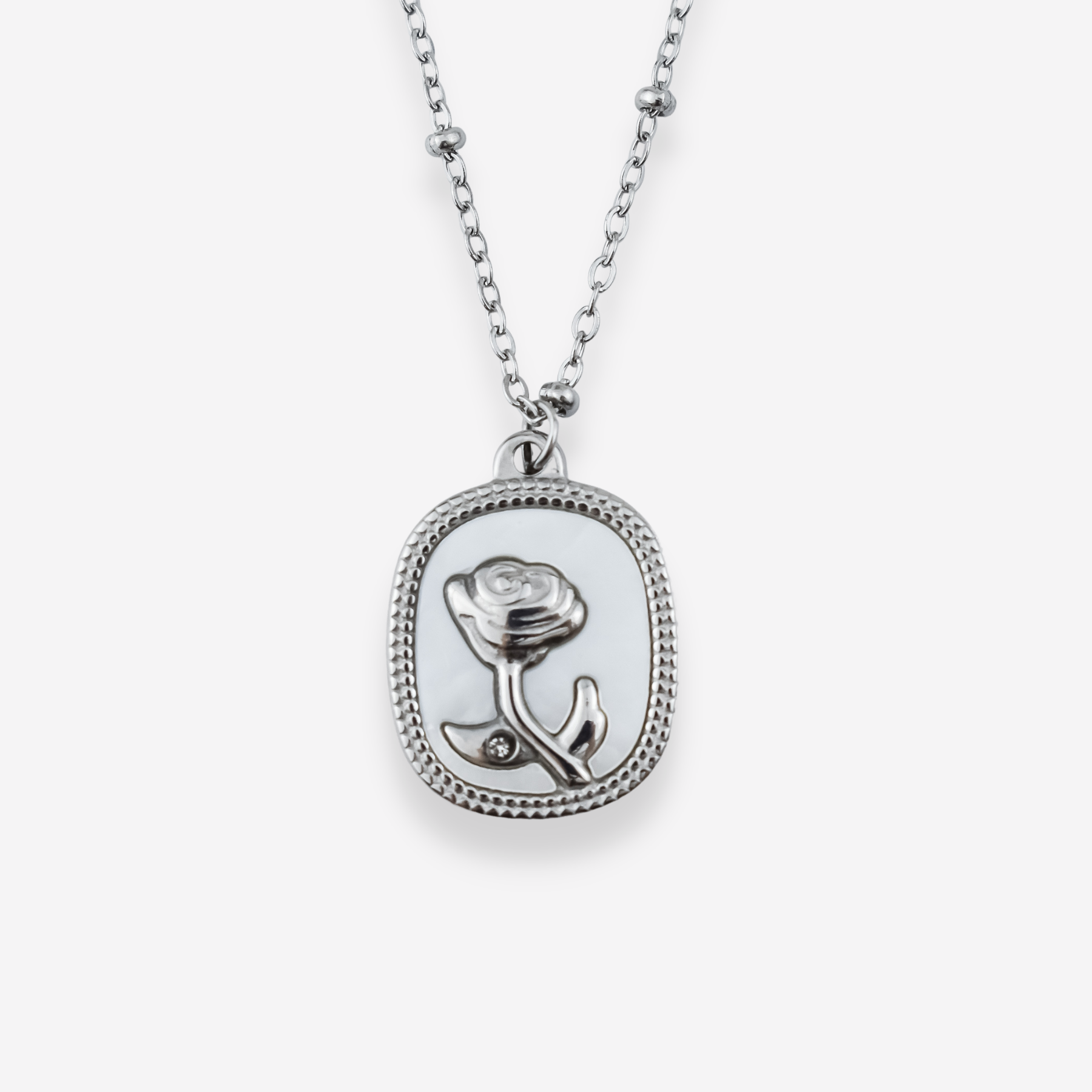 AURORA – Colar em Aço com Esferas e Medalha em Madrepérola com Rosa e Brilhante
