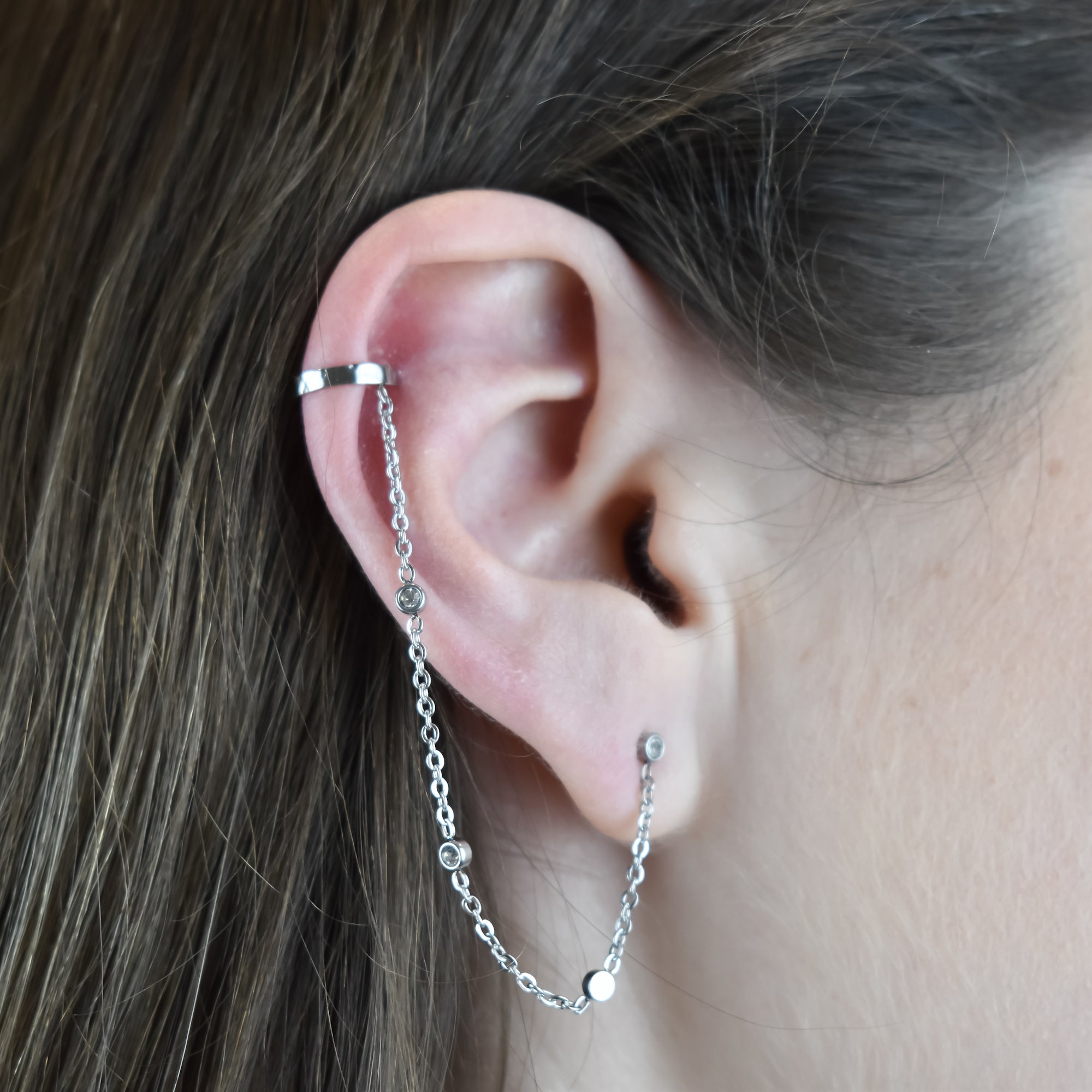 AMANDA – Ear Cuff Individual com Corrente e Brinco com Brilhante