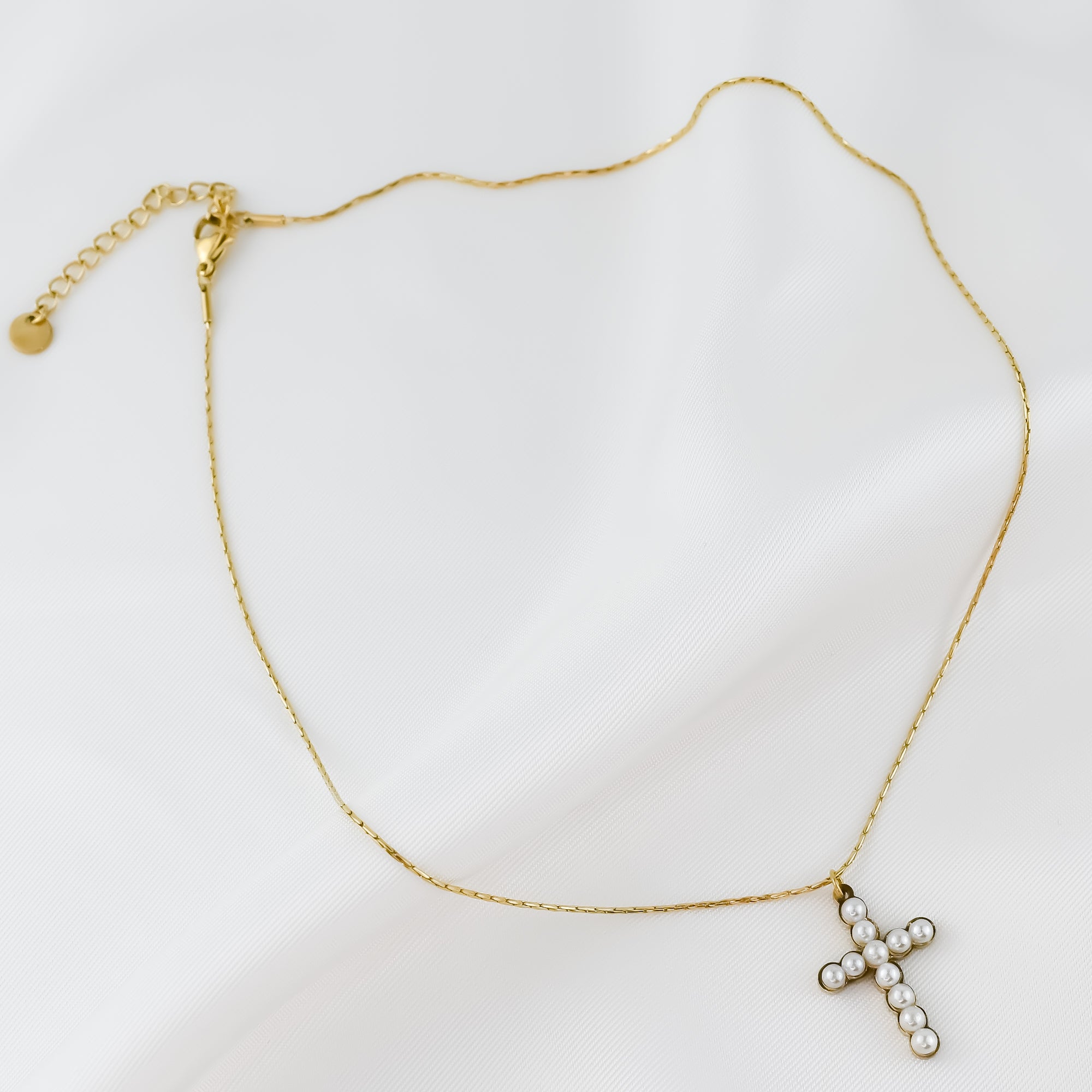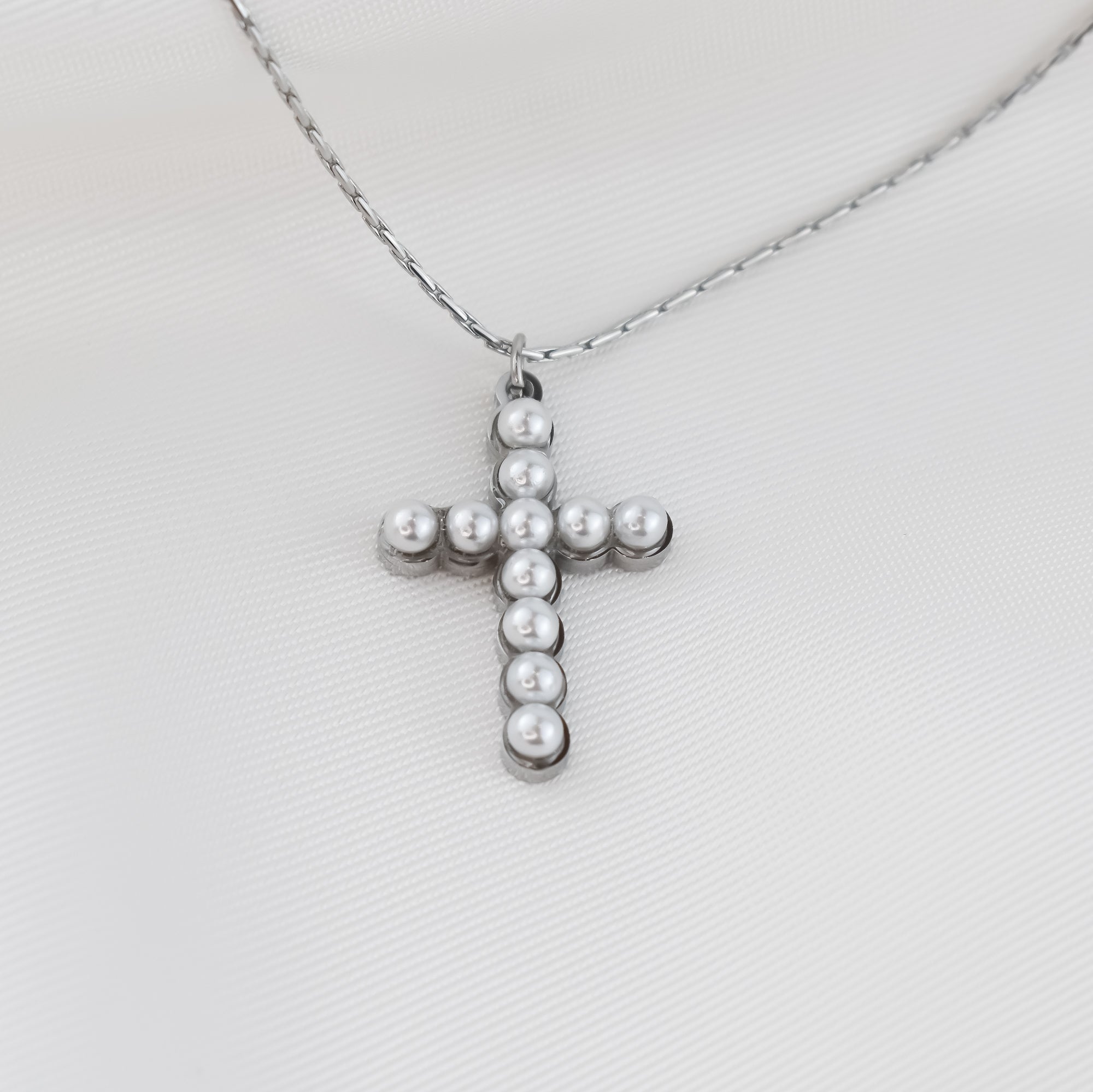 Este deslumbrante colar em aço inoxidável apresenta uma cruz elegante, delicadamente adornada por pérolas.