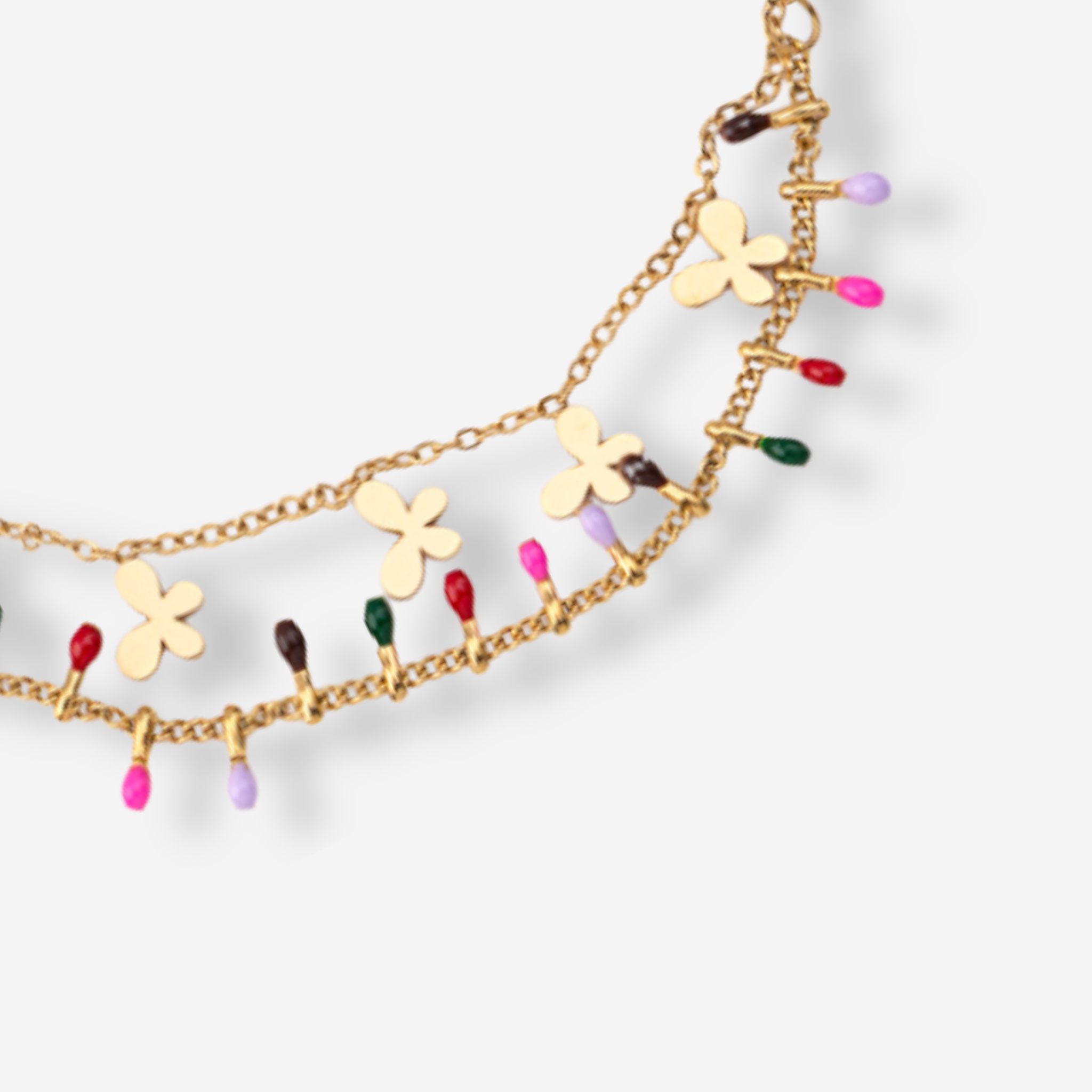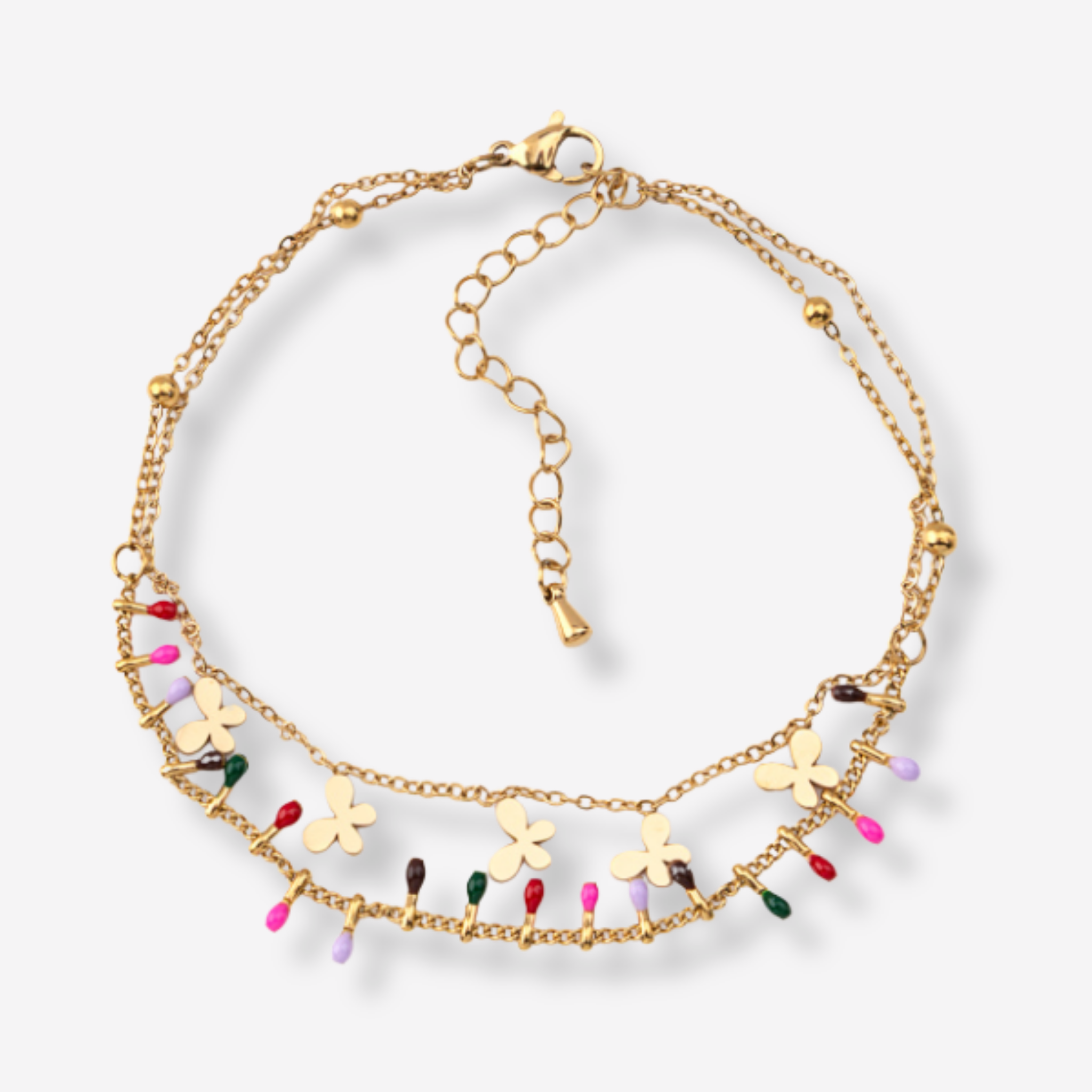 Tornozeleira Dupla Colorida com Borboletas em Aço Inoxidável
